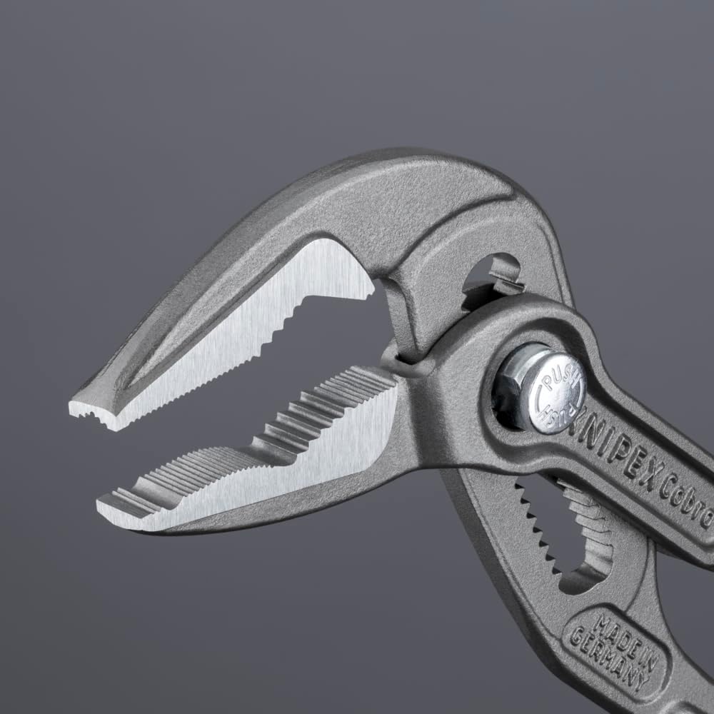 The Button-Push Adjustment Mechanism: Other manufacturers use teeth and grooves. Knipex engineered a push-button system with 18 positions that adjusts directly on the workpiece. This shouldn’t feel revelatory. It does anyway. Users report an almost spiritual satisfaction watching the mechanism engage—smooth, precise, inevitable. Like watching a Swiss watch tick, but for people who fix sinks.