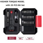 Magnetic bit holder with 6.35mm hex socket. Included 25-piece bit set spans Phillips, slotted, Torx,and hex configurations.